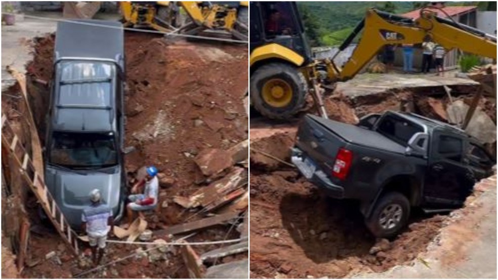 Duas retroescavadeiras foram usadas para retirar a caminhonete da cratera. Após a retirada, o veículo foi levado pelo seguro para uma oficina.