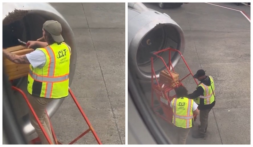 Funcionários de aeroporto retiram enxame de abelhas de turbina de avião, nos Estados Unidos — Foto: Reprodução/ABCUma cena inusitada chamou a atenção no Aeroporto Internacional Charlotte-Douglas, no estado da Carolina do Norte, nos Estados Unidos. Pouco antes da decolagem, a equipe identificou um enxame de abelhas que se instalou em um dos motores do avião, o que teria atrasado o voo em pelo menos uma hora.