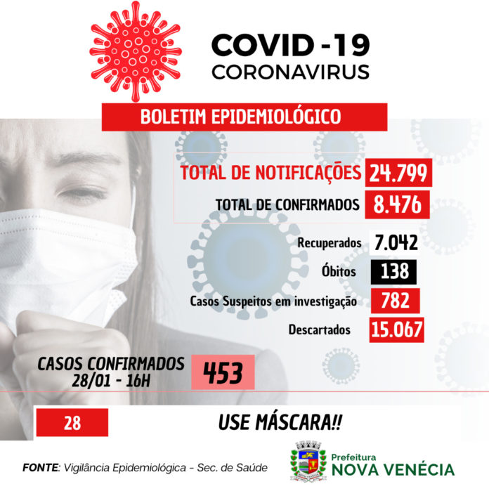 Com 24.799 notificações até o momento, desde o início da pandemia, Nova Venécia contabiliza 8.476 casos confirmados, 7.042 pessoas recuperadas, 138 óbitos confirmados. Atualmente 782 casos suspeitos estão em investigação e 15.067 investigações foram concluídas.