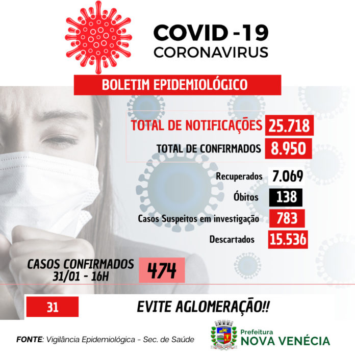 Com 25.718 notificações até o momento, desde o início da pandemia, Nova Venécia contabiliza 8.950 casos confirmados, 7.069 pessoas recuperadas, 138 óbitos confirmados. Atualmente 783 casos suspeitos estão em investigação e 15.536 investigações foram concluídas.