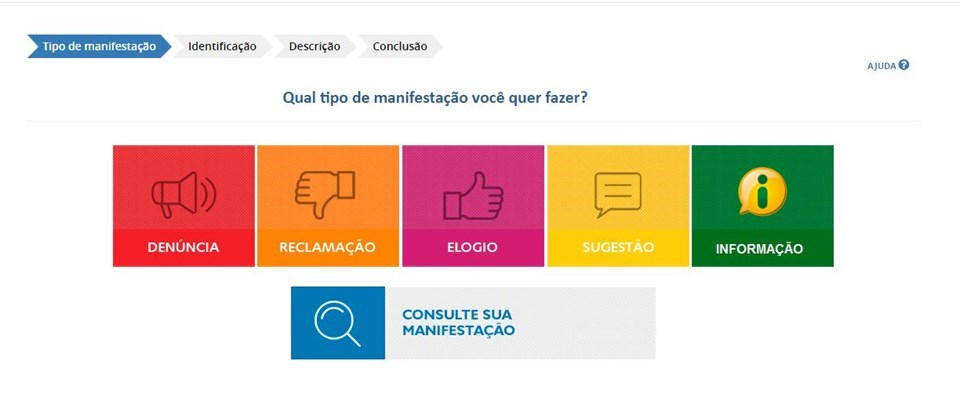 Na página seguinte, o usuário deve clicar em "Nova Manifestação" e depois escolher a opção "Denúncia". Em seguida, o cidadão deve escolher se a denúncia será identificada, sigilosa ou anônima e escolher a Sefaz como destinatário da manifestação.