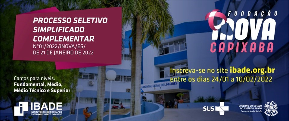 A Fundação Estadual de Inovação em Saúde - iNOVA Capixaba, por meio do Instituto Brasileiro de Apoio e Desenvolvimento Executivo (Ibade), divulga o novo processo seletivo simplificado complementar, com 140 vagas destinadas à contratação imediata, além de formação de cadastro de reserva para hospitais da Grande Vitória e Linhares. As inscrições têm início nesta segunda-feira (24) e seguem até 10 de fevereiro.