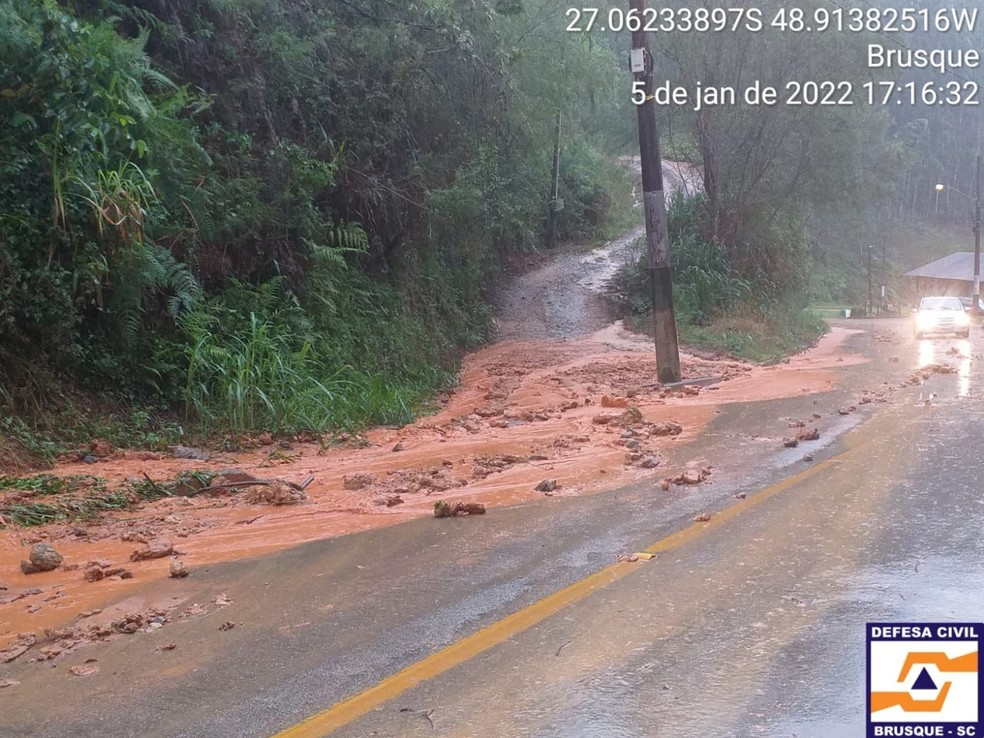 Defesa Civil registrou deslizamento de terra em Brusque (SC) — Foto: Defesa Civil/ Reprodução |