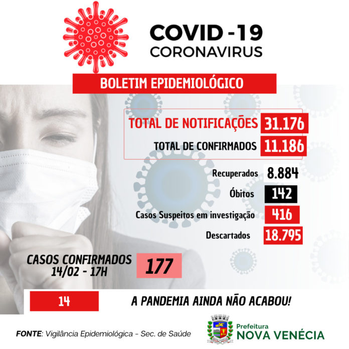 Com 31.176 notificações até o momento, desde o início da pandemia, Nova Venécia contabiliza 11.186 casos confirmados, 8.884 pessoas recuperadas, 142 óbitos confirmados. Atualmente 416 casos suspeitos estão em investigação e 18.795 investigações foram concluídas.