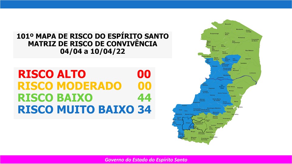 RISCO BAIXO: Alfredo Chaves, Água Doce do Norte, Águia Branca, Anchieta, Apiacá, Aracruz, Atílio Vivácqua, Barra de São Francisco, Boa Esperança, Cachoeiro de Itapemirim, Cariacica, Castelo, Conceição da Barra, Ecoporanga, Fundão, Guarapari, Ibiraçu, Iconha, Itapemirim, Jaguaré, João Neiva, Linhares, Mantenópolis, Marataízes, Mimoso do Sul, Montanha, Mucurici, Muqui, Nova Venécia, Pedro Canário, Pinheiros, Piúma, Ponto Belo, Presidente Kennedy, Rio Bananal, Rio Novo do Sul, São Mateus, Serra, Sooretama, Vargem Alta, Viana, Vila Pavão, Vila Velha e Vitória.