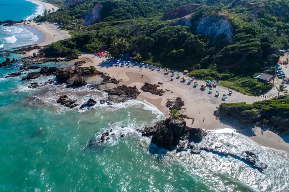 Praia de Tambaba, na Paraíba, tem duas áreas divididas por uma formação rochosa com vegetação: uma destinada ao naturismo e outra onde usar roupa ou não é opcional — Foto: Marco Pimentel/PBTur |