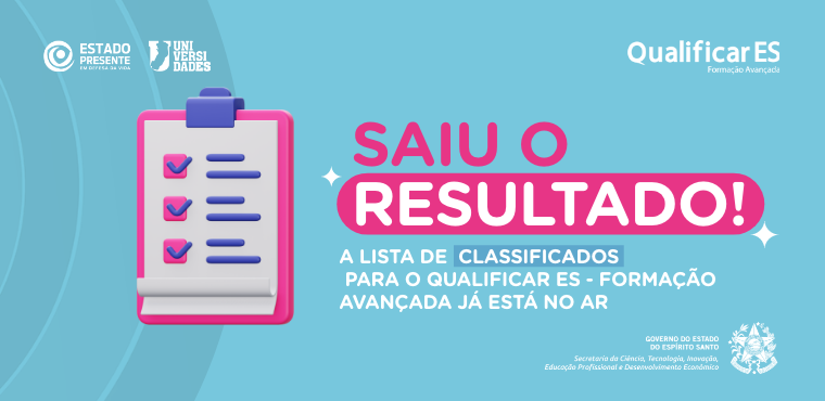 O Governo do Estado, por meio da Secretaria de Inovação e Desenvolvimento (Sectides), publicou na terça-feira (29) a lista de classificados para os cursos ofertados pelo Qualificar ES - Formação Avançada. O programa integra o Sistema Universidades do Espírito Santo, a UniversidadES. O resultado está disponível no site www.universidades.es.gov.br (em primeira chamada) ou diretamente no link https://universidades.es.gov.br/editaisabertos.