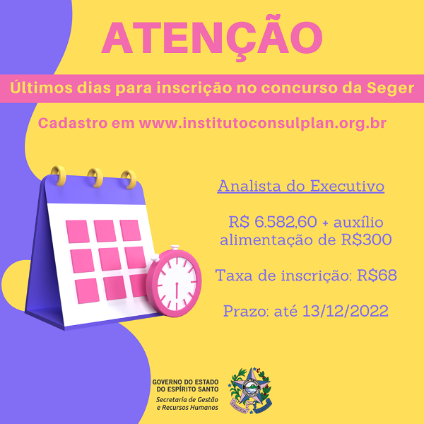 Encerra às 16 horas da próxima terça-feira (13) o prazo para inscrições no concurso público da Secretaria de Gestão e Recursos Humanos (Seger) referente ao cargo de Analista do Executivo. O cadastro pode ser efetuado pelo site da banca organizadora - www.institutoconsulplan.org.br. A taxa para se inscrever é de R$ 68,00.