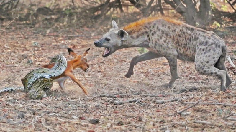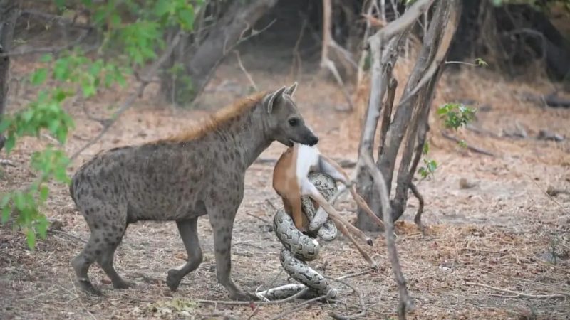 O vídeo mostra que a Hiena foi paciente, tentando morder a Píton para forçá-la a se soltar, mas acabou decidindo pegar tanto a cobra quanto o filhote e correu o grupo por cerca de 15 metros até deixá-los cair.