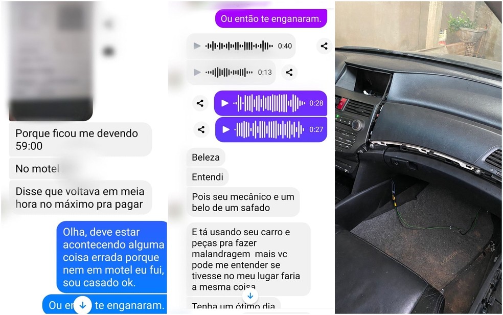 Mensagens que o dono do carro recebeu do responsável do motel // carro já sem as peças — Foto: Divulgação/Polícia Civil |