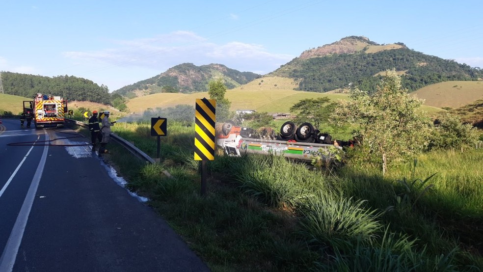 Caminhão com combustíveis tomba na BR-101, em Iconha, no ES, e rodovia fica interditada. — Foto: Divulgação/PRF |