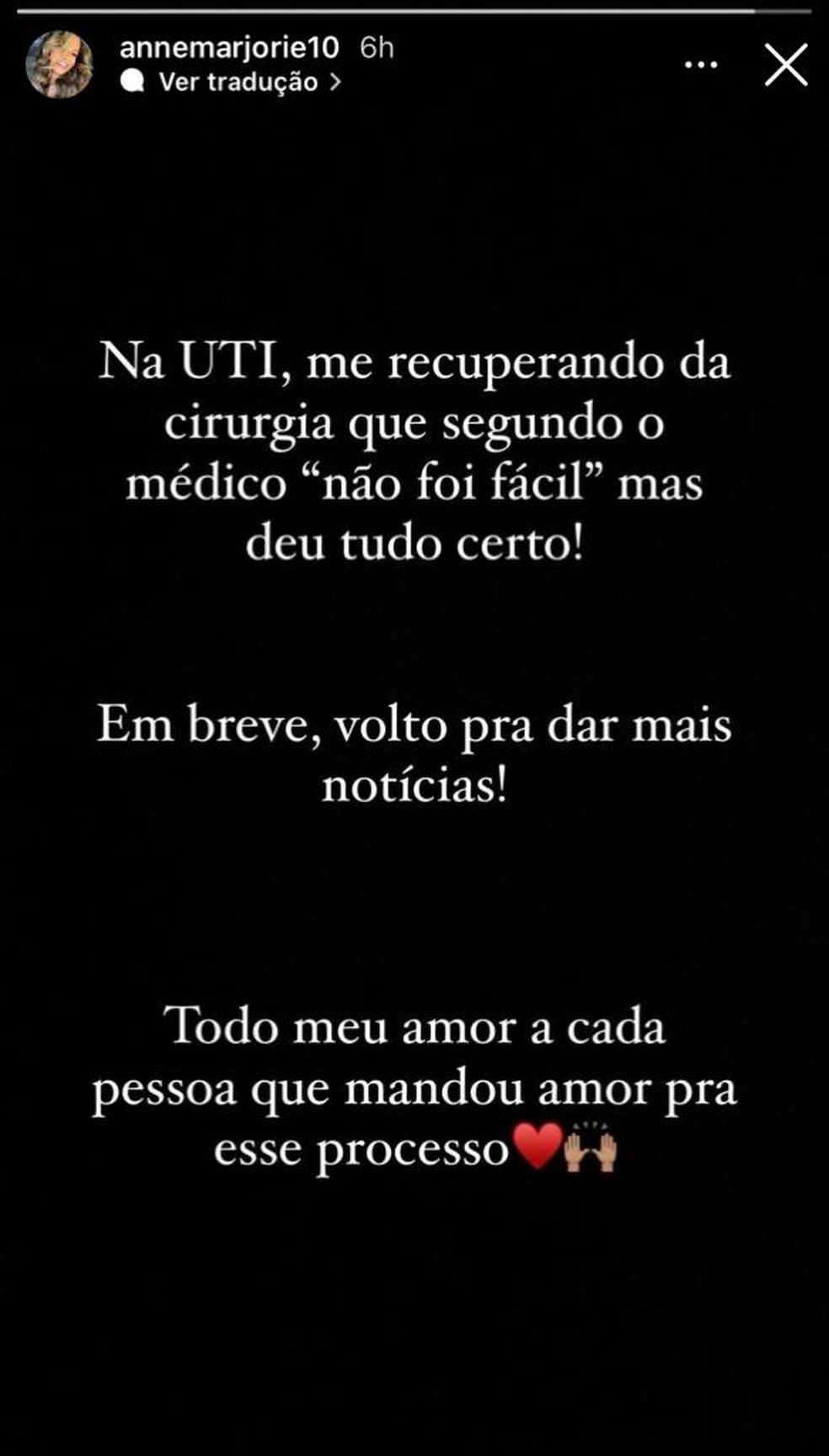 Anne Marjorie atualiza quadro de saúde após ablação — Foto: Reprodução/Instagram |