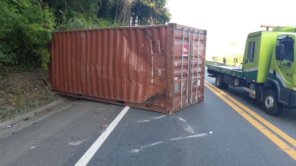O acidente também envolveu uma carreta que transportava um contêiner, que ficou caído no meio da rodovia.