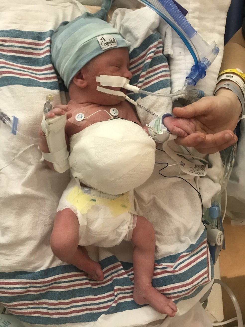 Quando Katie Everett estava grávida, ela fez um ultrassom e ouviu o que nenhum pai ou mãe nesta situação gostaria de ouvir: havia uma complicação com o bebê. “Eles fizeram o exame e a médica disse: ‘Tem um bebê lá’, mas nos explicaram que ele tinha algo chamado onfalocele”, lembra a mãe, em entrevista à Fox. Isso significa que o menino tinha uma malformação rara, que fazia com que alguns de seus órgãos se desenvolvessem do lado de fora de seu corpo.