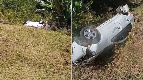 Carro da prefeitura de Pancas capota em acidente no fim da tarde de quinta-feira (6), na estrada que segue para o distrito de Vila Verde. (Leitor | A Gazeta)