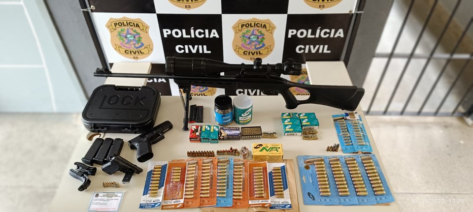 As armas e algumas munições apreendidas pela PCES estavam guardadas dentro de um cofre. As demais munições foram encontradas em outros cômodos da residência.