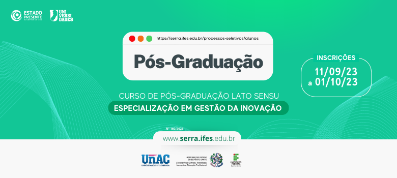 A Secretaria da Ciência, Tecnologia, Inovação e Educação Profissional (Secti) inicia, nesta segunda-feira (11), as inscrições de alunos para o curso de Pós-graduação Especialização em Gestão da Inovação. O curso é realizado em parceria com o Instituto Federal da Educação, Ciência e Tecnologia do Espírito Santo (Ifes), por meio da Universidade Aberta Capixaba (UnAC), do Sistema UniversidadES, na modalidade a distância. As inscrições seguem abertas até o dia 1º de outubro.