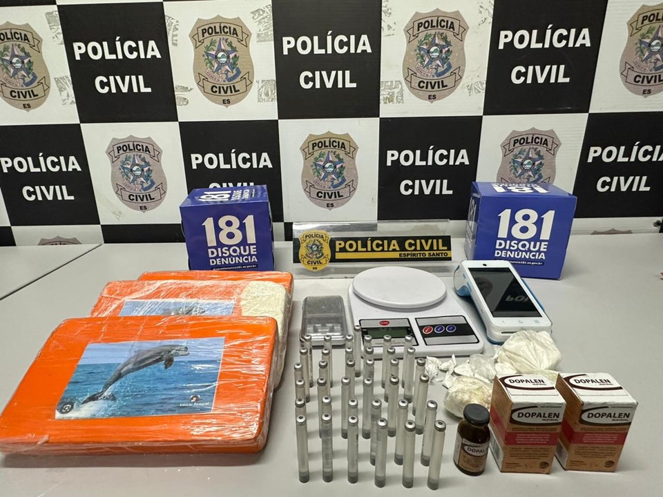 Foram encontradas porções de drogas armazenadas em um compartimento oculto do veículo e, posteriormente, foram apreendidos na residência três quilos de cocaína pura, 36 frascos de lidocaína, três frascos de anestésico, duas balanças de precisão e anotações do tráfico.