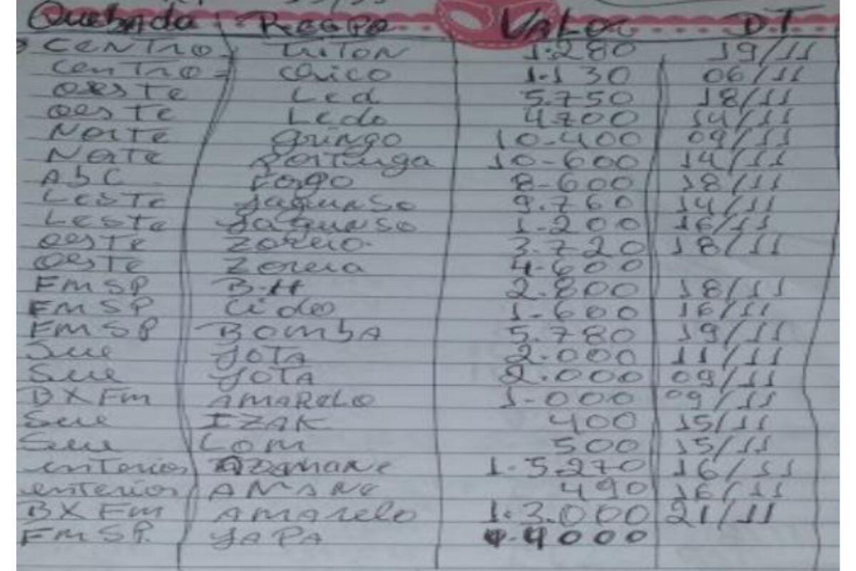 Na residência do casal também foram apreendidas anotações (veja galeria abaixo) com os valores da venda de drogas em diferentes pontos. A contabilidade indicava os valores a serem recebidos das “biqueiras”, monitoradas por Luiz, em toda a capital paulista, Grande São Paulo e interior. Foi também encontrada a relação de imóveis e veículos, avaliados entre R$ 40 mil e R$ 250 mil, que seriam rifados pela facção.