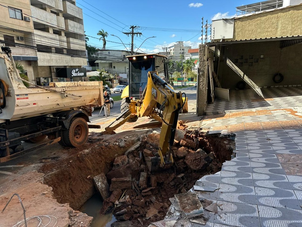 | Funcionários da Prefeitura de Cachoeiro foram ao local onde cratera se abriu em calçada e engoliu homem — Foto: Prefeitura de Cachoeiro/Divulgação |