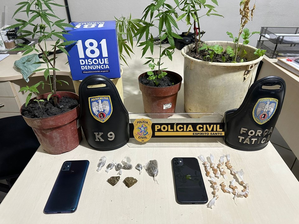 Também foram localizadas oito buchas de maconha no sofá da casa, motivo pelo qual o investigado foi encaminhado à delegacia para a lavratura do termo circunstanciado por posse de drogas para consumo próprio. Após prestar declaração, o mesmo foi liberado.