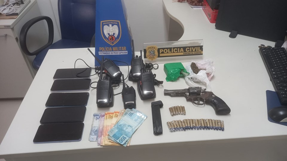 Nas buscas, foram encontrados um revólver calibre .38 municiado com seis munições intactas, diversas munições adicionais, maconha e cinco rádios comunicadores, além de R$ 529,00 em espécie e cinco aparelhos telefônicos.