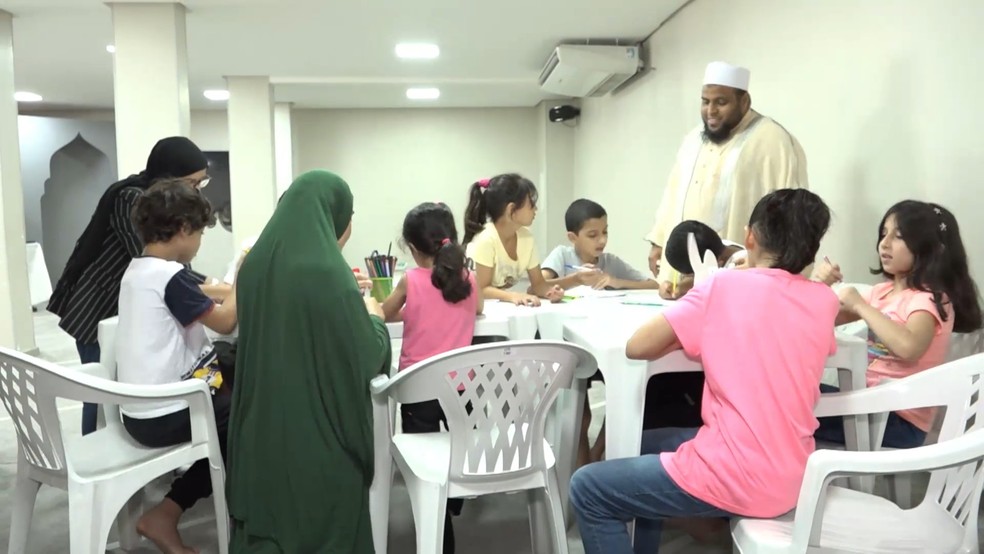 Crianças palestinas que fugiram da guerra na Faixa em Gaza aprendem português em mesquita em Vitória. Espírito Santo — Foto: TV Gazeta |