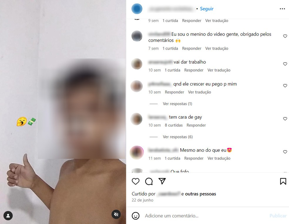 ➡️Neste outro perfil, um garoto de 8 anos escolheu uma imagem sua sem camiseta e comemorou que foi selecionado no desafio: “Eu sou o menino do vídeo, gente, obrigado pelos comentários!”. Quais comentários? Um deles era “quando ele crescer, eu pego para mim”; outro dizia “tem cara de gay”.