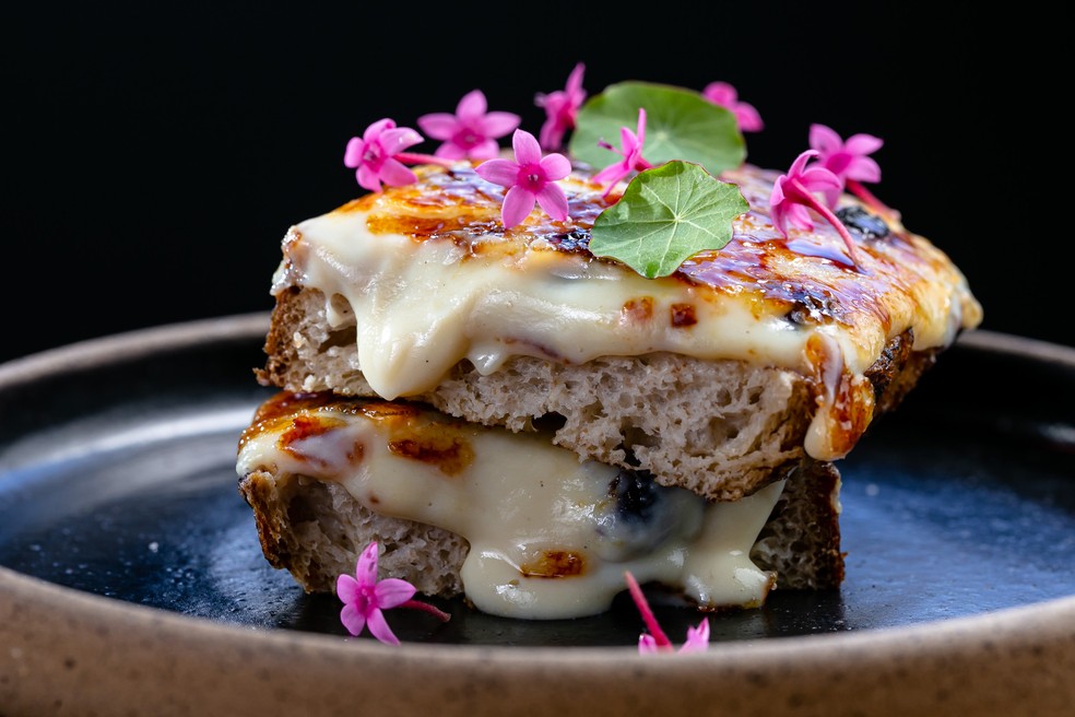 Prato: Toast de queijo minas, gorgonzola, nozes e damasco