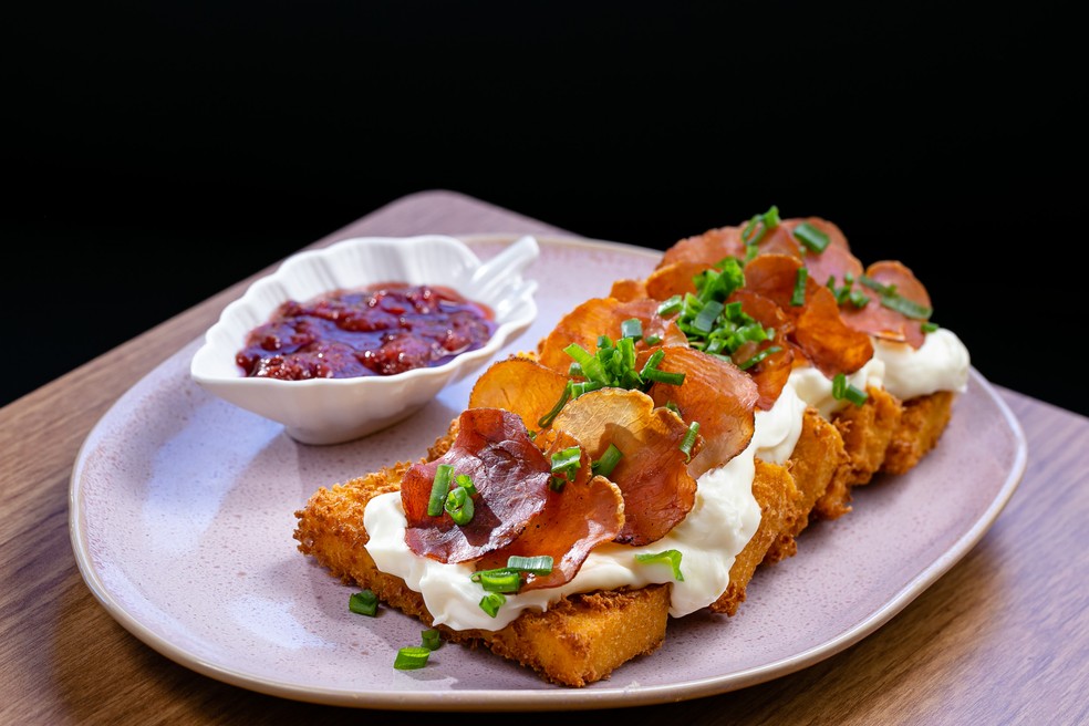 Prato: Bruschetta de Polenta (4 unidades de polentas fritas com fubá da região, sendo duas com bacalhau no azeite de coentro e duas com tomate concassé no azeite de manjericão finalizado com queijo parmesão)