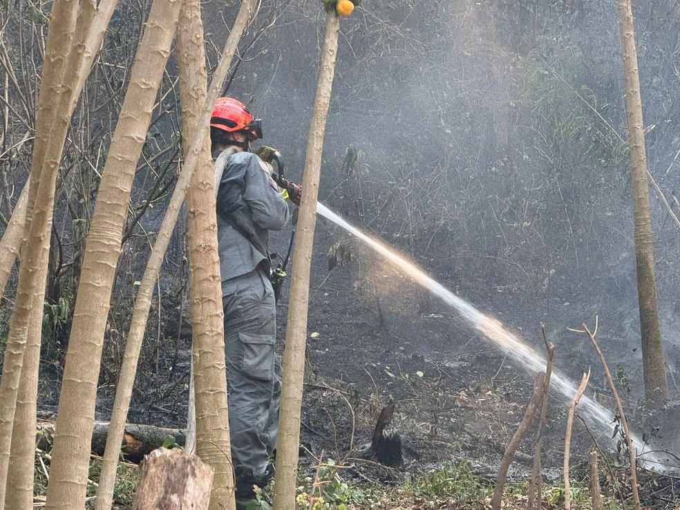 | Bombeiro apaga incêndio em área de mata da Zona Norte de SP — Foto: Abraão Cruz/TV Globo |