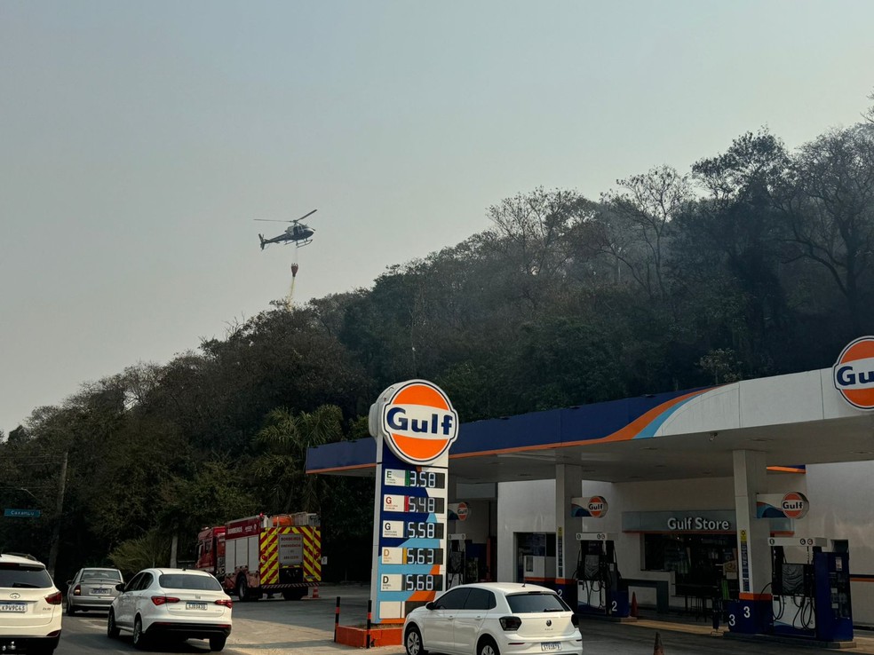 Segundo a Polícia Militar, por volta das 16h, o incêndio próximo ao posto já estava extinto, mas seguia ativo na área de mata.