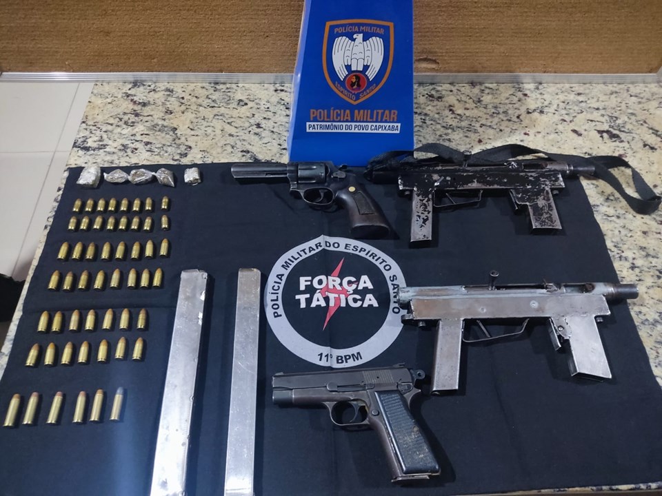 Durante o patrulhamento a pé, os policiais localizaram os suspeitos que tentaram fugir, mas foram rapidamente detidos. Na abordagem, foram encontradas duas submetralhadoras calibre 9mm de fabricação semi-industrial, uma pistola calibre 9mm, um revólver calibre 38, carregadores e munições de diversos calibres, além de cinco buchas de maconha e uma balança de precisão.