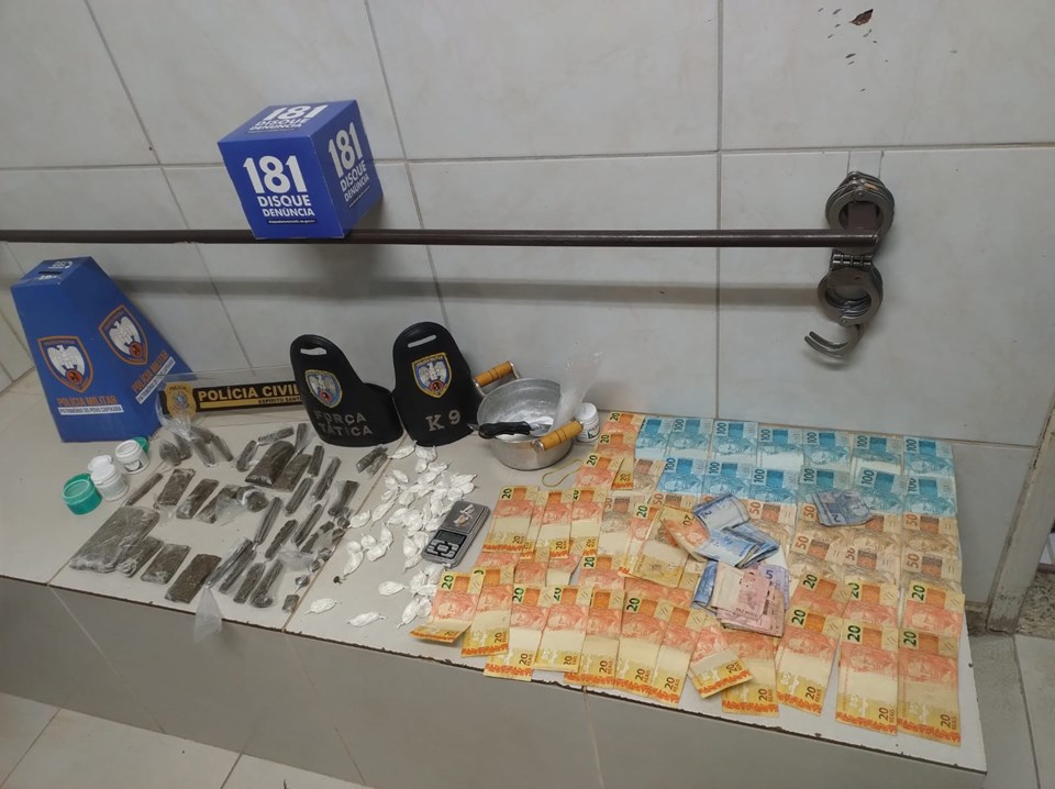 De posse do mandado de busca e apreensão, os policiais realizaram buscas no imóvel e encontraram material ilícito no quarto do suspeito. Foram apreendidos 44 papelotes de cocaína, duas pedras de crack, 495 gramas maconha e sete buchas do mesmo entorpecente, material para embalo e preparo da droga, uma balança de precisão e R$ 3.038 em espécie, além de celulares.