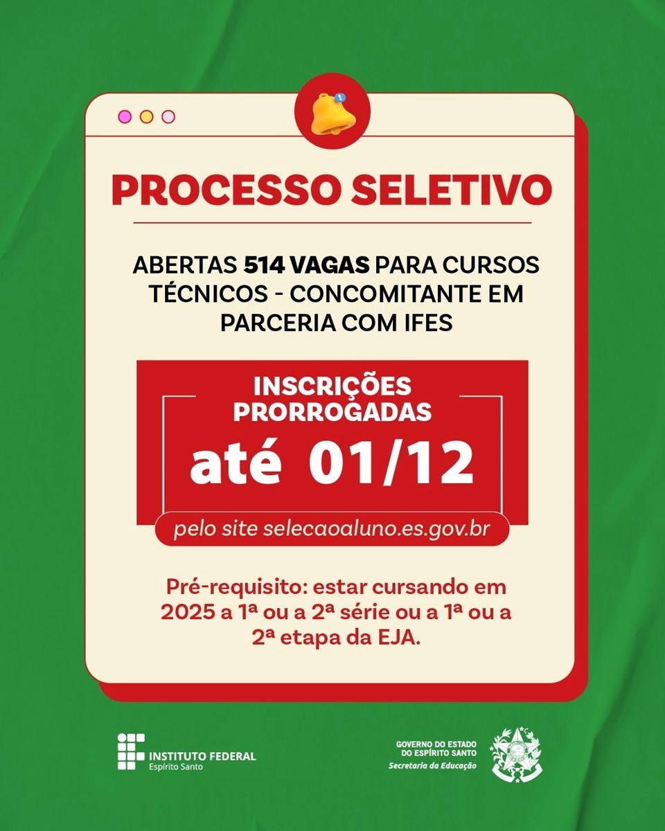 Estão prorrogadas até dia 1º de dezembro as inscrições para o Processo Seletivo Nº 45/2024 com a oferta de 514 vagas em cursos técnicos de nível médio na forma concomitante, em parceria multicampi com o Instituto Federal de Educação, Ciência e Tecnologia do Espírito Santo (Ifes). O processo seletivo abrange diversas áreas de formação e visa preencher vagas para o primeiro e segundo semestres de 2025 (2025/1 e 2025/2).