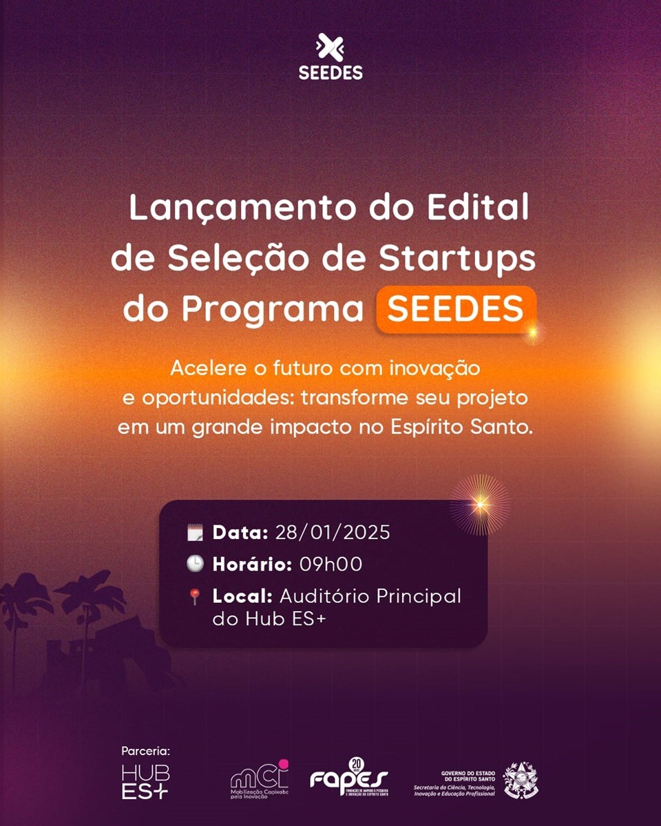O Governo do Espírito Santo realiza, no dia 28 de janeiro de 2025, às 9h, o evento de lançamento do edital de seleção de startups para o Programa Seedes, no Hub ES+, localizado em Vitória. A iniciativa visa impulsionar o ecossistema de inovação capixaba, fomentar o empreendedorismo e acelerar startups com alto potencial de impacto socioeconômico.