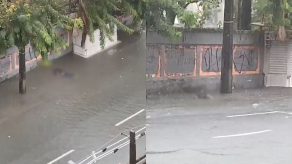 Imagens que circulam nas redes sociais mostram o corpo do homem caído em meio à água acumulada nas proximidades de um colégio particular.