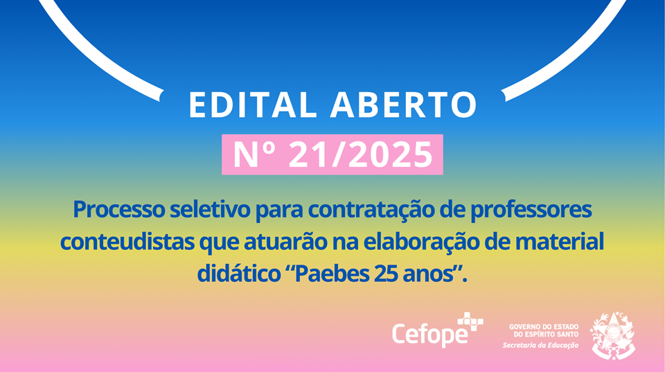 Segundo o edital, os materiais elaborados serão utilizados em ações formativas que integram as atividades comemorativas dos 25 anos do Paebes. A seleção é voltada para profissionais com experiência em avaliação educacional e produção de conteúdos didáticos, com o objetivo de contribuir para o fortalecimento da cultura avaliativa na rede estadual.