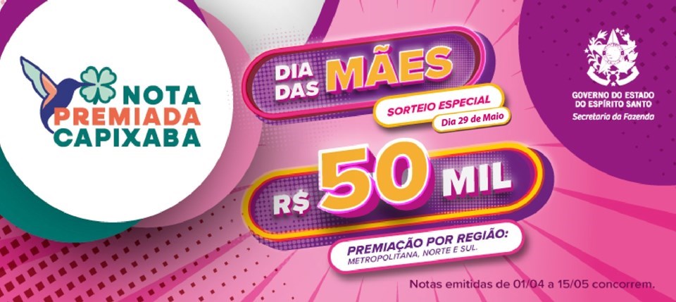 Já pensou substituir a lembrancinha de Dia das Mães por um presentão? Então, fique ligado nessa dica: o Nota Premiada Capixaba fará, no próximo dia 29 de maio, o primeiro Sorteio Especial de Dia das Mães. A premiação inédita vai sortear um prêmio de R$ 50 mil para cada uma das regiões: a Metropolitana, a norte e a sul. Estarão concorrendo aos prêmios os bilhetes gerados pelas notas fiscais de compras emitidas entre os dias 1º de abril e 15 de maio.