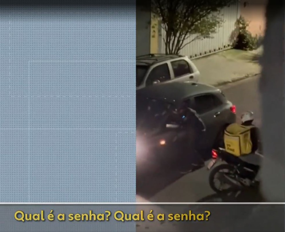 Assustada, a mulher revela a combinação, anotada pelo outro criminoso, que usa uma mochila de entrega nas costas. Em seguida, os dois assaltantes fogem, levando também um relógio e anéis da motorista.