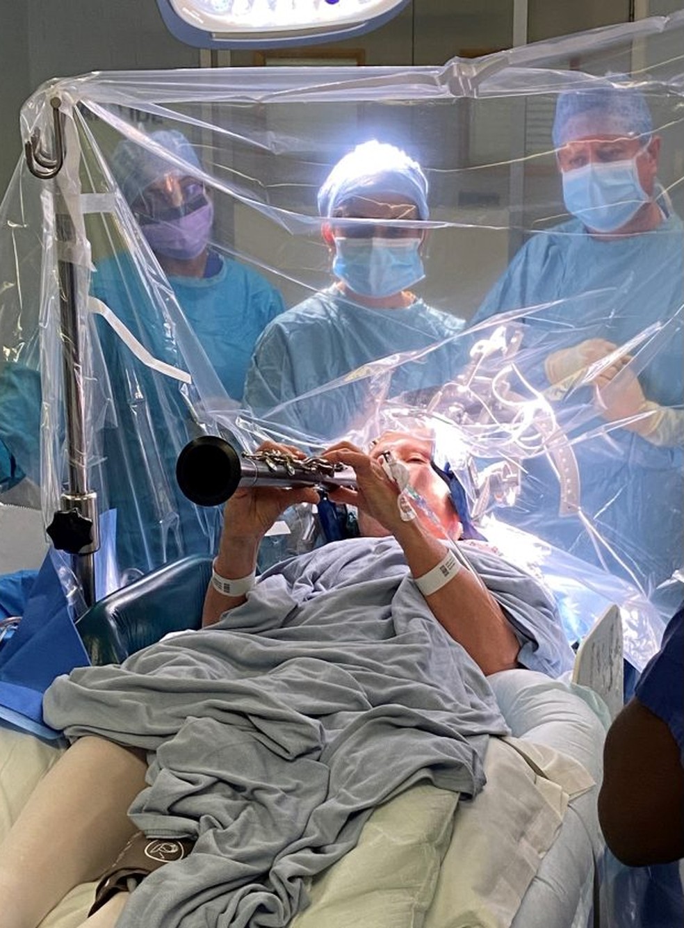 Uma mulher com doença de Parkinson conseguiu retomar os movimentos e tocar clarinete durante uma cirurgia no Reino Unido.
