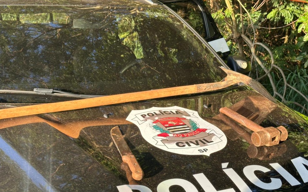 Pá, facão e marreta, utilizados no crime, foram apreendidos — Foto: Murilo Badessa/EPTV