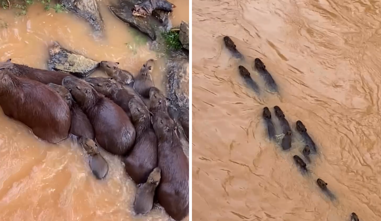 Ele seguia para o Centro da cidade, quando avistou várias capivaras dentro do Rio Fundão e decidiu parar para registrar a cena em vídeo. Nas imagens, é possível ver as capivaras enfrentando a correnteza e atravessando o curso d’água em grupo. São cerca de 20 animais, sendo alguns filhotes.